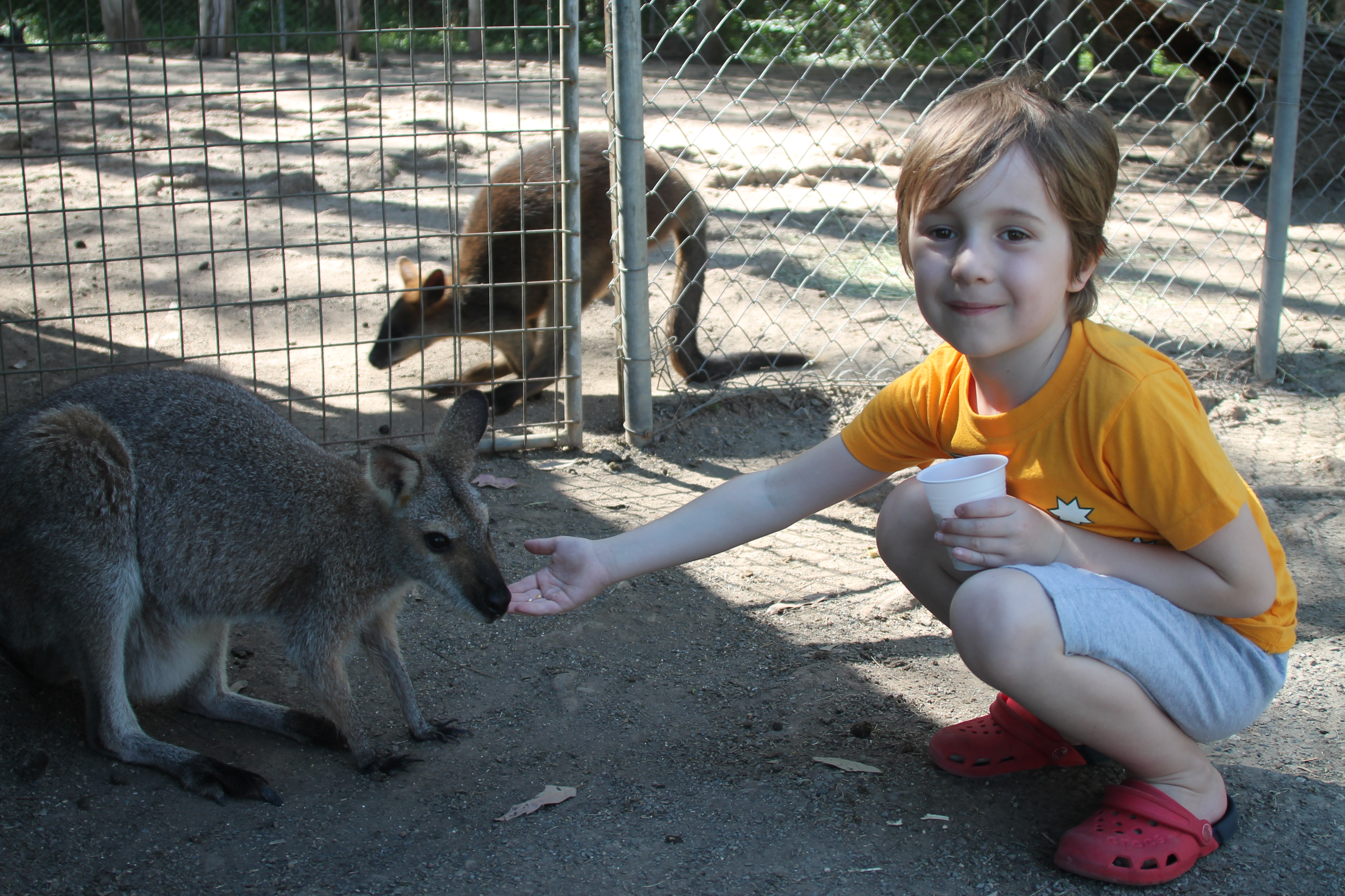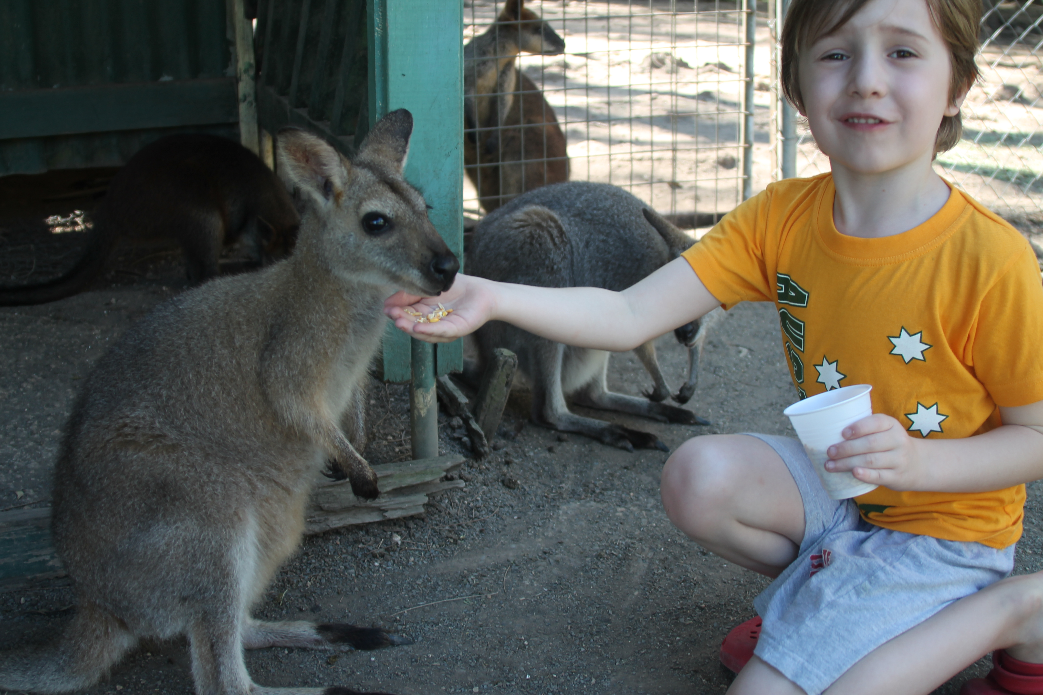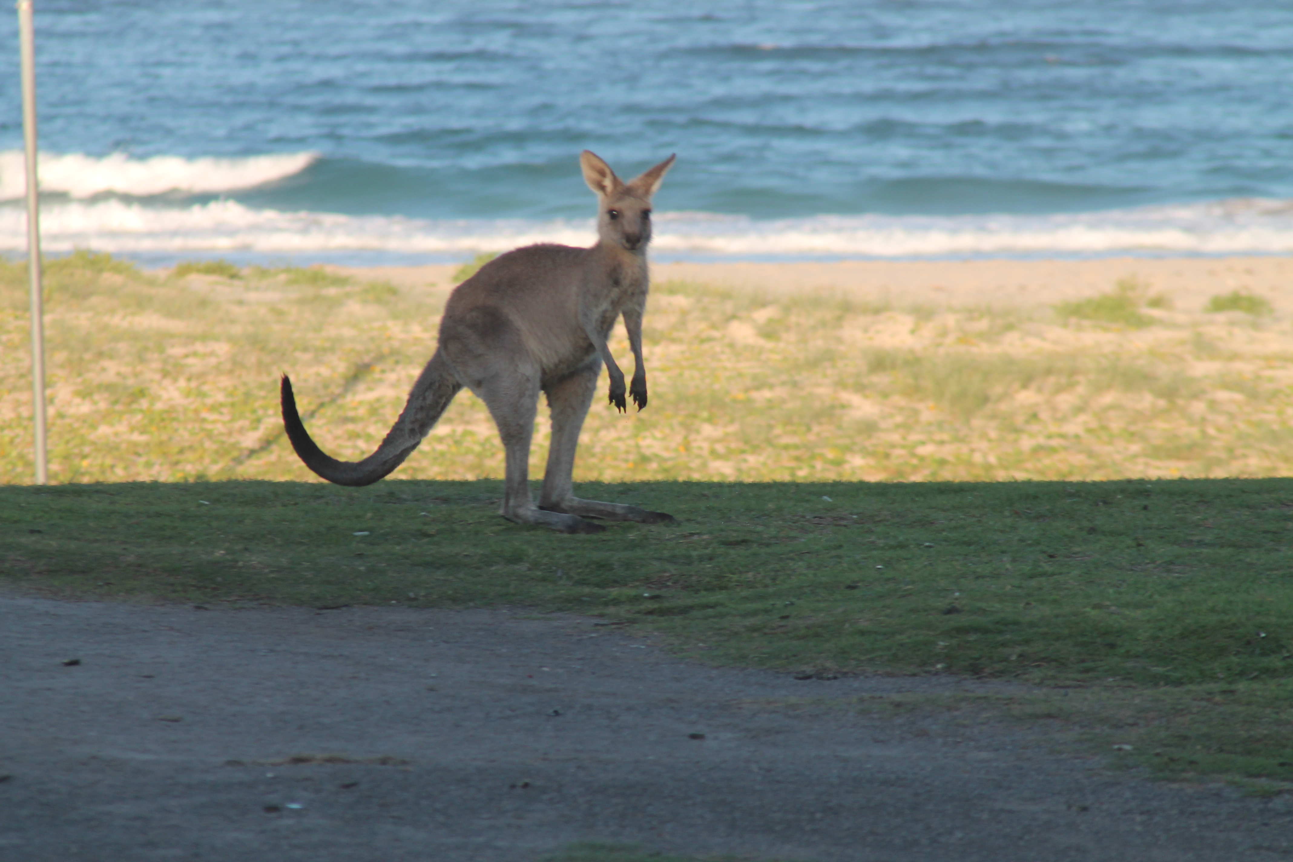 We hoped to see Kangaroos in Australia, of course, and we were not disappointed. In fact, we have seen more than expected! Our campsite at Merry Beach was full of them in the afternoon, and seveal dozens even stayed for the night. Karine was very surprised to find two of them even sleeping directly in front of our camper van. Later, in a Zoo in Port Macquarie, Basti was able to feed some of them! It is really cute when the little ones hop into her mom’s bag, but I only saw it twice and was not able to take a shot.
