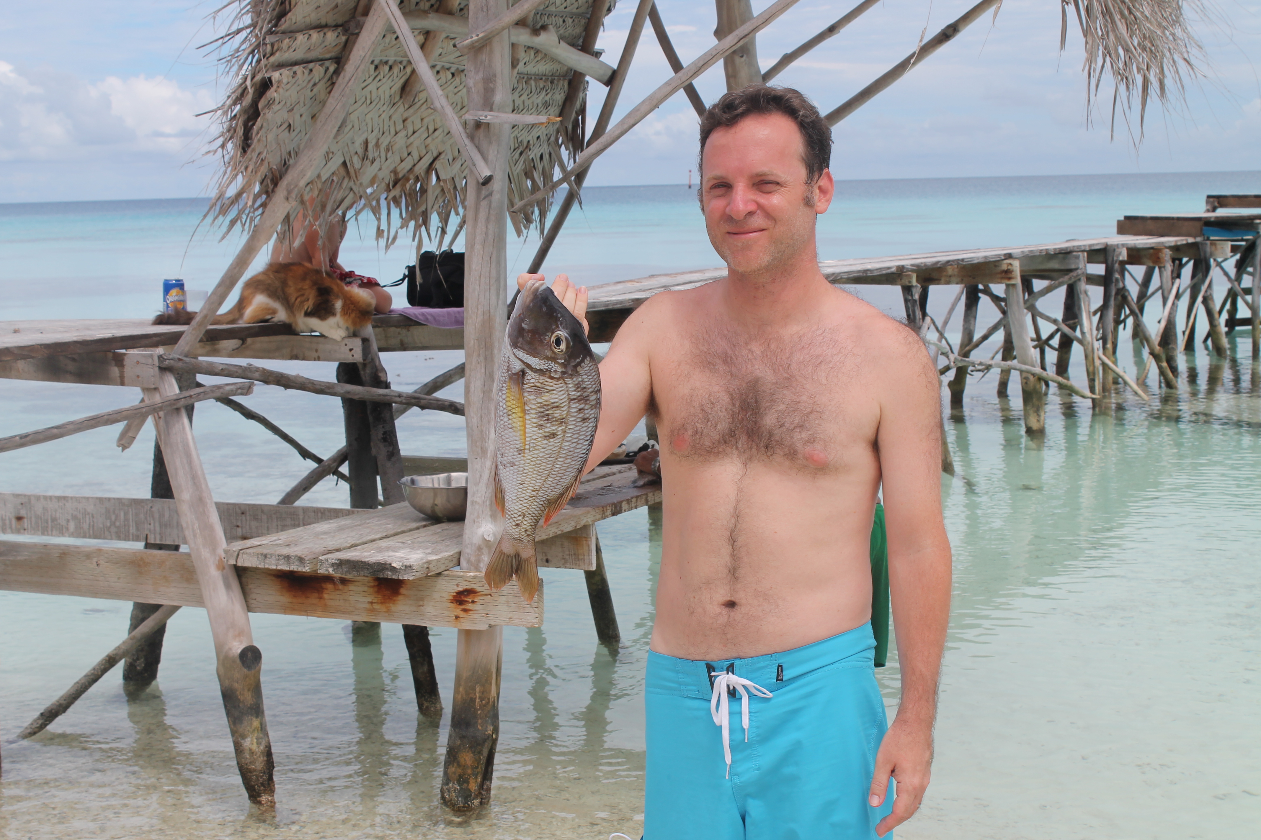 Bilan d’une heure de peche à la palangrotte sur le bateau de la pension voisine : un requin (eh oui !), un Tamouré (que l’on va déguster ce soir grâce aux talents de cuisinière de Flora, la proprio de la pension), une loche et un poisson de 2 ou 3 kg rejeté à l’eau car toxique…dommage.