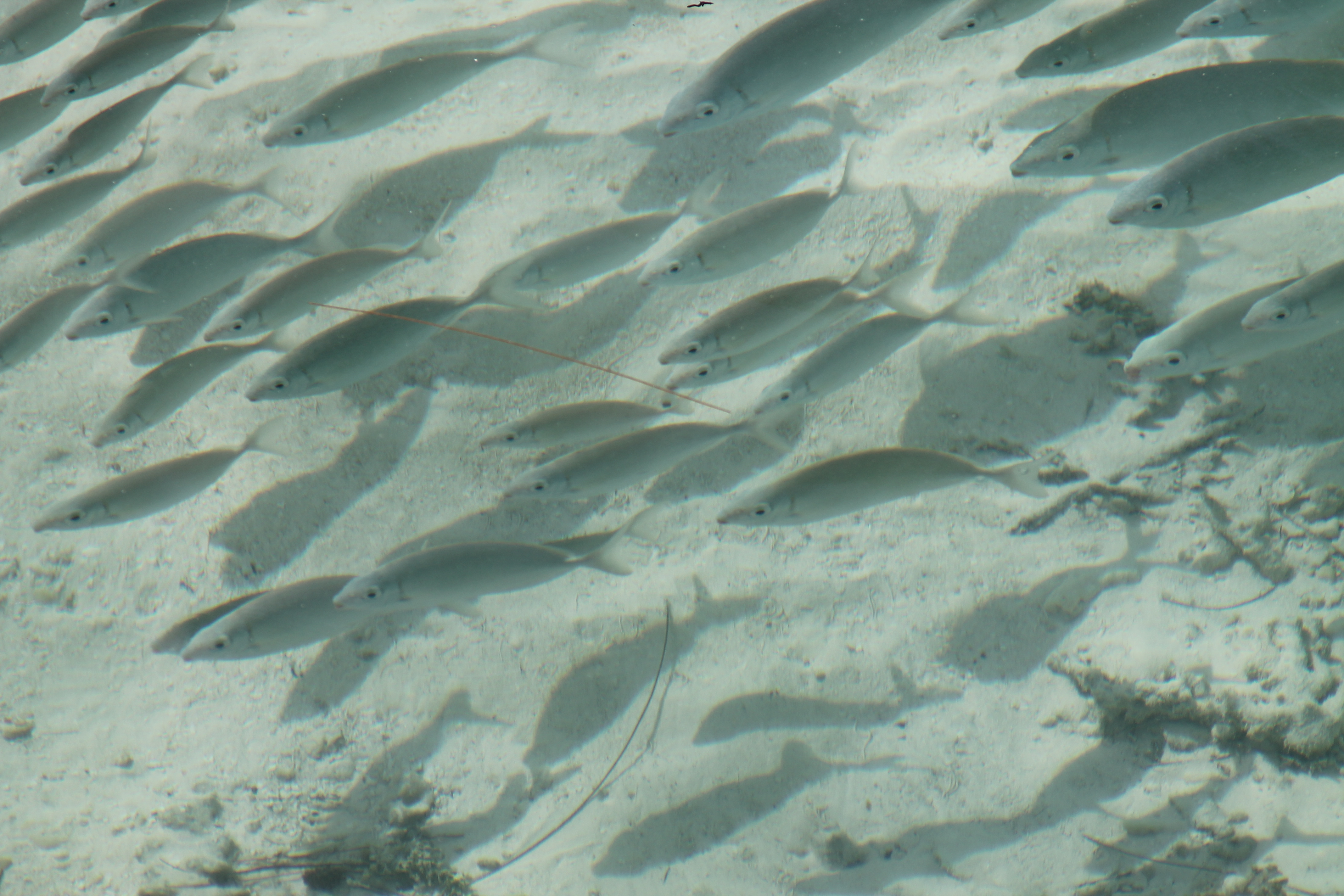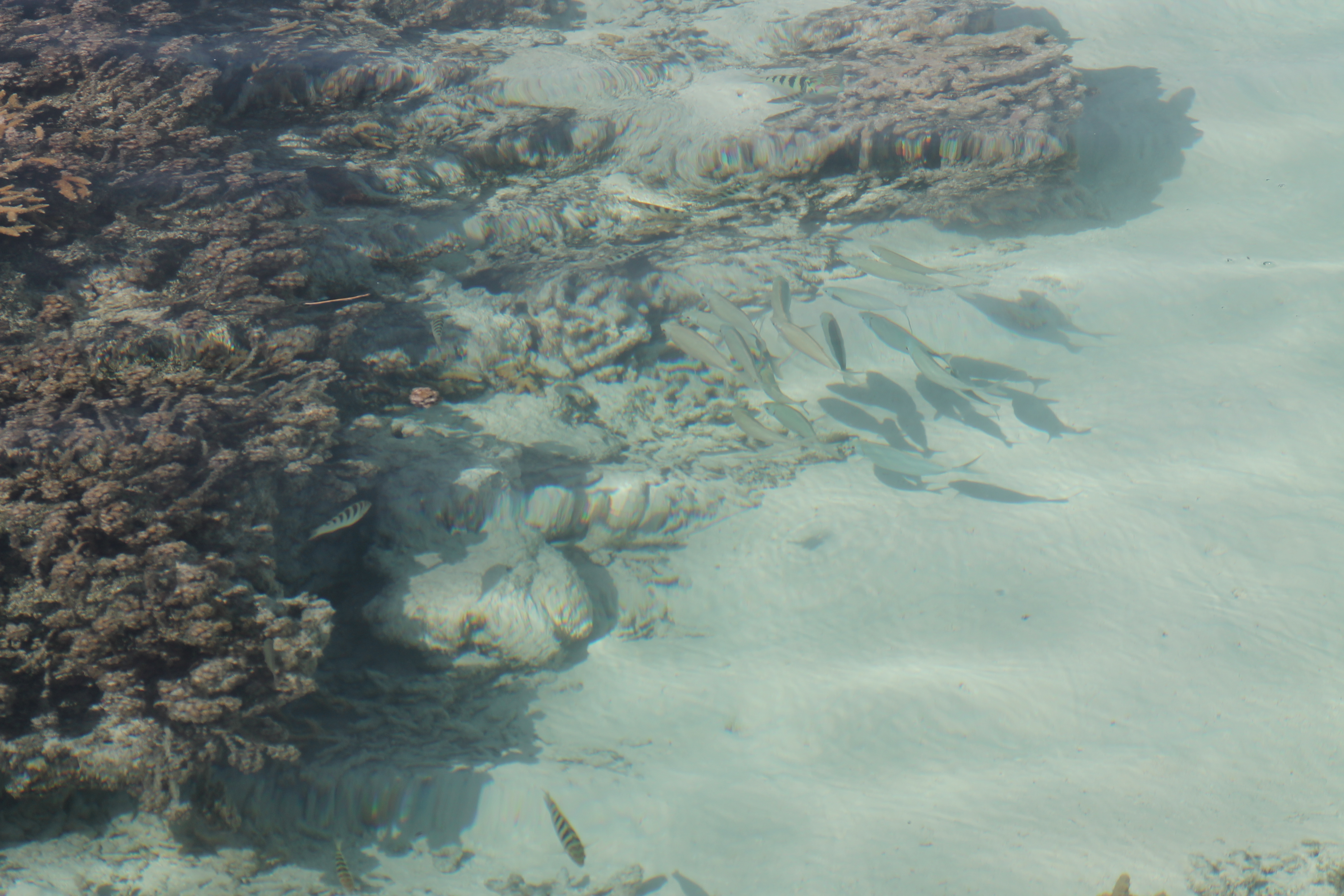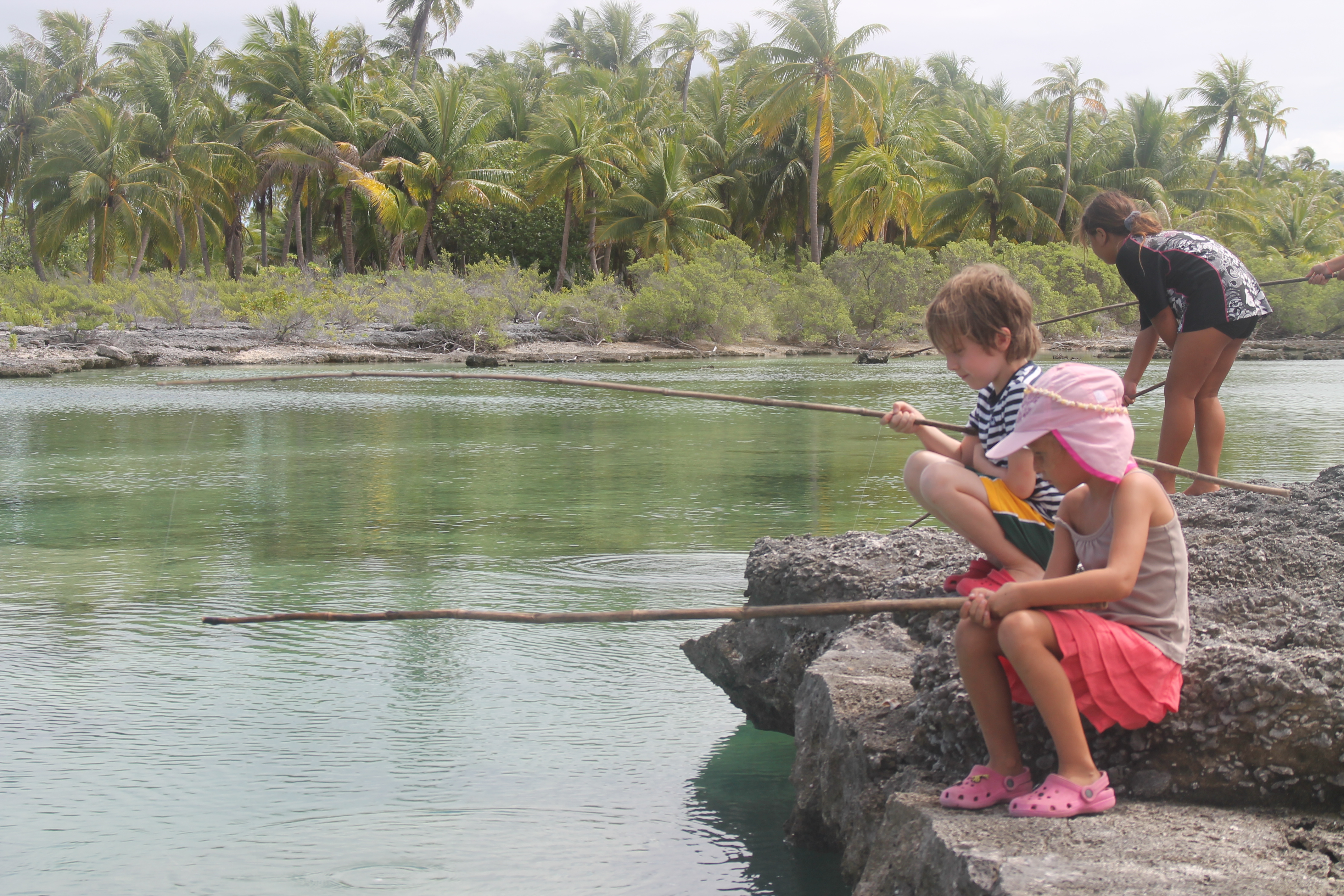 Avant, il y avait plein de poisson, maintenant il n’y a plus rien…disent les locaux. Plus rien c’est relatif. Petit inventaire du jour : 4 ou 5 requins, un Tamouré (péché ce matin à la palangrotte), 3 loches, une Murène, une quantité impressionnante de poissons perroquets, de poissons papillons, quelques néons, 3 poulpes, des taurillons, des aiguillettes (oui, oui, j’ai un lexique sous les yeux…), et quelques 5 ou 6 espèces que je ne suis pas parvenue à identifier…le tout dans 50 cm d’eau (y compris les requins). Puisqu’on vous le dit, il n’y a plus rien…
